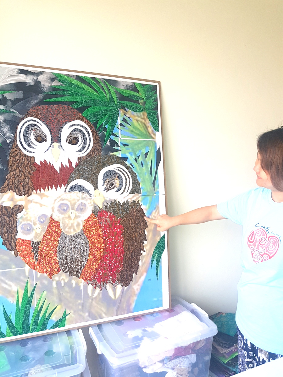 ‘Wah’ and ‘Ooooh’ was the first (and only) thing you hear as we entered her studio, just like her subway experience, we too went googoo gaga over the art pieces. This is especially amplified when we laid our eyes on her ‘kebaya songket girls’ as well as her ‘owl family’ piece. Awestruck (I wasn’t even this awestruck when I saw Sheila Majid during her concert recently). First thing that came into my mind (and I verbalized it [after all, I can only contain so much]) was ‘Kak Latifah, berapa harga ni?’ / how much does this piece cost?, wanting to own it.